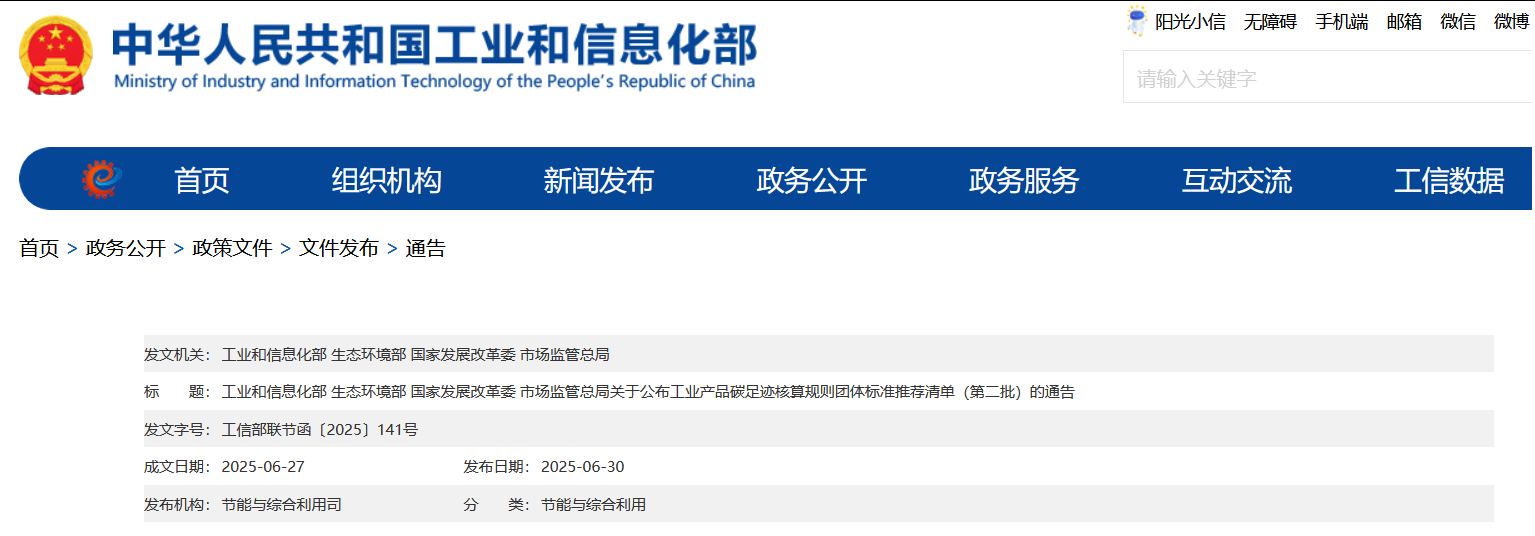 • 2025-08-06 工業(yè)和信息化部等四部門(mén)關(guān)于公布工業(yè)產(chǎn)品碳足跡核算規(guī)則團(tuán)體標(biāo)準(zhǔn)推薦清單(第二批)的通告